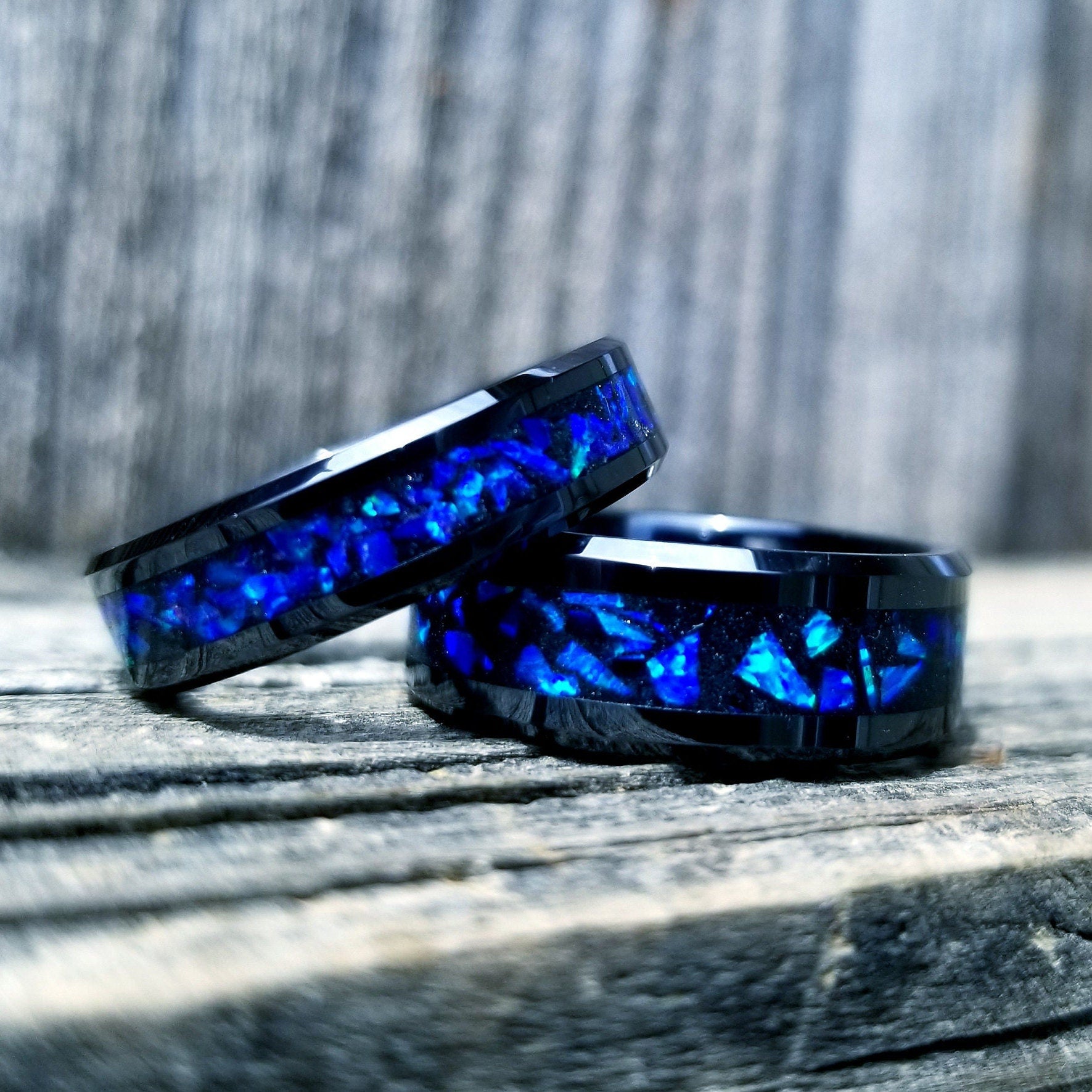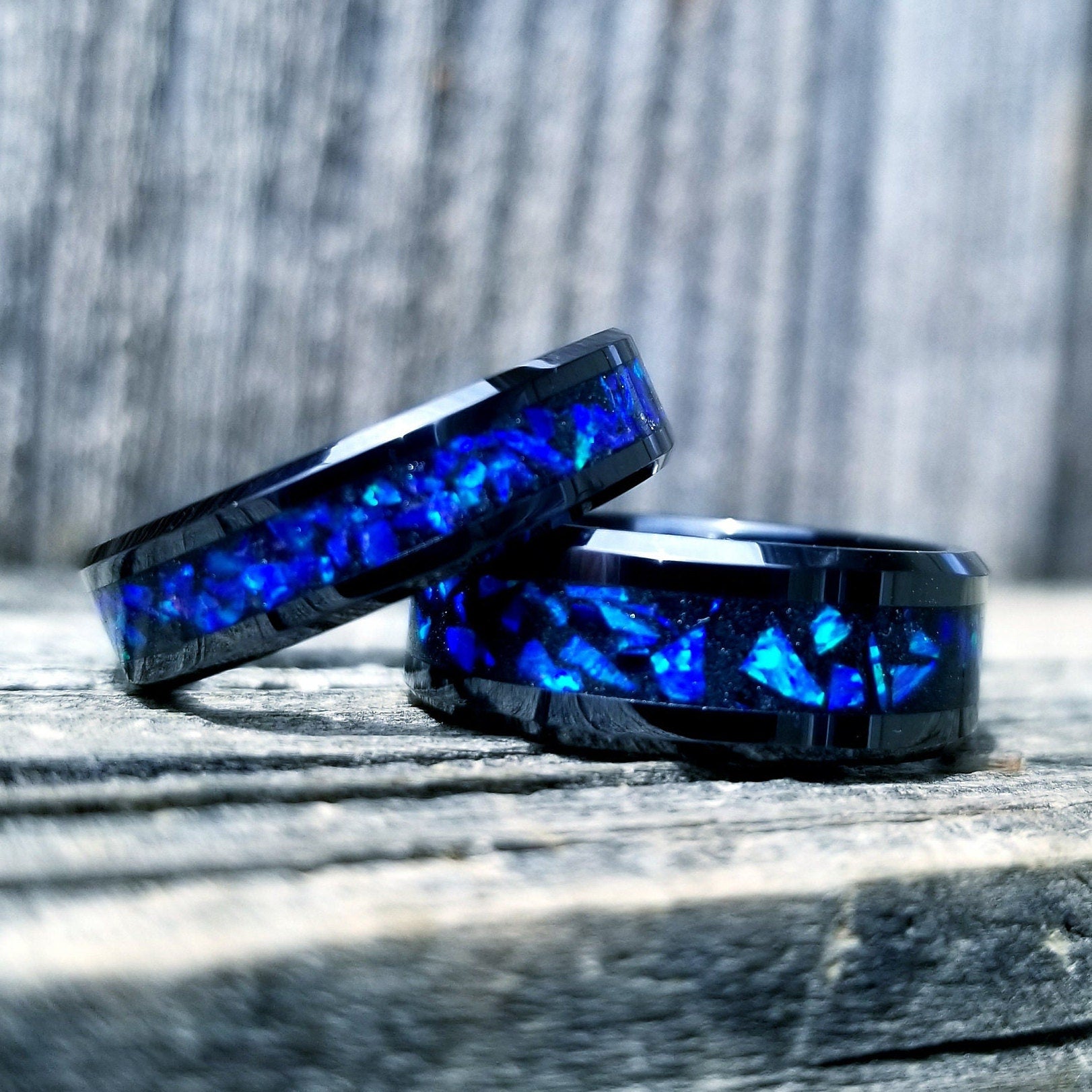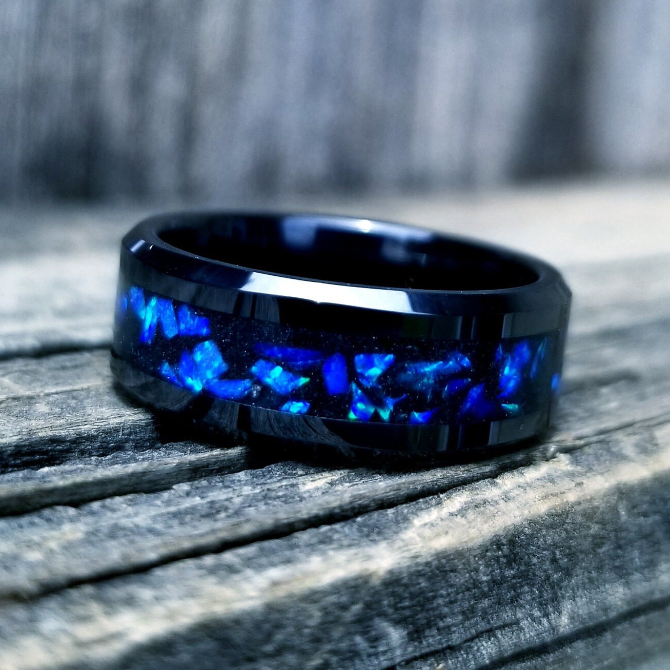 This ring features your choice of a 6mm or 8mm black ceramic band that is inlaid with glowstone and blue lavender opal that flickers an array of stunning blue, green, and purple colors.